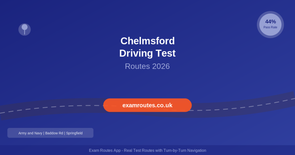 Master the Army and Navy roundabout from every direction. Practise Great Baddow residential streets with parked cars. Build dual carriageway confidence for Springfield routes. Drive at test times for realistic traffic conditions. Use the Exam Routes App for turn-by-turn route practice.