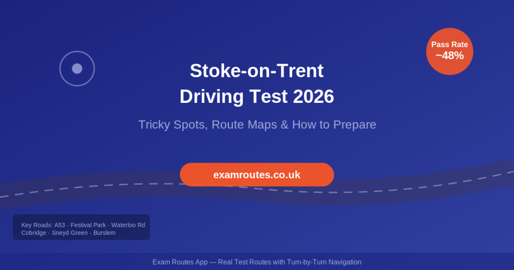 The Stoke-on-Trent driving test centre is located in the Cobridge area, serving learners from across the Potteries, Newcastle-under-Lyme, and the surrounding Staffordshire towns. If you are preparing for your practical test at this centre in 2026, this guide covers everything you need to know — from the test routes and tricky spots to pass rates and practical preparation tips.