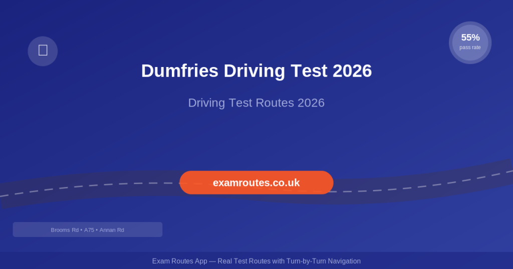 Dumfries Driving Test Centre on Brooms Road is the main practical test centre for Dumfries and Galloway in south-west Scotland. With a pass rate of around 55% — comfortably above the national average — it is one of the more forgiving centres in the country. That said, the routes include country roads, the A75 trunk road and busy town-centre junctions that still catch out unprepared candidates. Here is everything you need to pass at Dumfries in 2026.