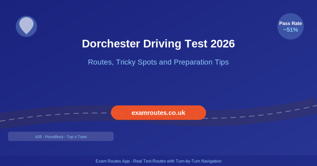 The Exam Routes App provides real driving test routes for Dorchester with turn-by-turn navigation. Build familiarity with every junction and roundabout before test day.