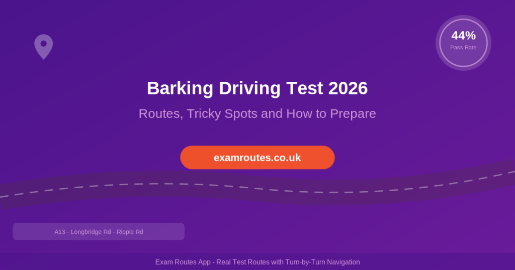 Barking has a pass rate of approximately 44%, which is below the national average of around 49%. This is typical for inner-London test centres where traffic density and road complexity are significantly higher than in suburban or rural areas. Do not be discouraged — with thorough practice on the local roads, you can absolutely pass first time.
